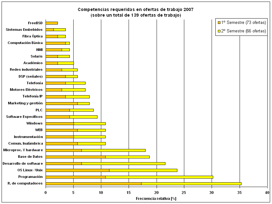 Por otro lado, las competencias menos requeridas entre las ofertas laborales recibidas son: FreeBSD con solo un 2% del total de ofertas, y las competencias en Fibra Óptica y Sistemas Embebidos, ambas mencionadas en sólo un 3,6% del total de ofertas recibidas durante el año 2007.