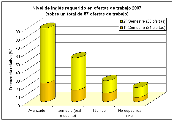 A partir del análisis realizado sobre las ofertas de trabajo recibidas en el 2007 que requieren dominio del idioma inglés, se concluye que un 61% solicita un nivel de dominio avanzado. Esta cifra es seguida por el nivel intermedio con un 37% del total de ofertas que solicitan inglés.