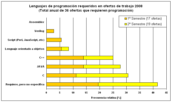 Se analiza que del total de ofertas de trabajo de requieren aptitudes en programación, un 42% de éstos no detalla dicho requerimiento. Además, se aprecia en el gráfico que los 3 lenguajes de programación más demandados durante el 2008 son: Lenguaje C, presente en un 31% de las ofertas que requieren conocimientos en programación, Java con un 27% y C++, con el 25% de las ofertas.