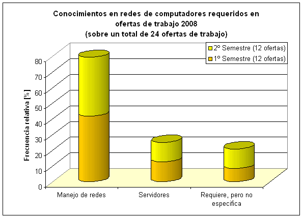 Observando el gráfico anterior, se concluye que cerca de un 80% de las ofertas de trabajo que requieren conocimientos en redes de computadores espefican el manejo de redes. Muy por debajo le sigue el manejo de servidores con tan solo un 20,8% del total de ofertas.