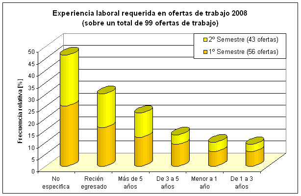 Se concluye a partir de este análisis que un 46% de las ofertas recibidas durante el año 2008 no detallan entre sus requerimientos la experiencia laboral necesaria para realizar el trabajo.