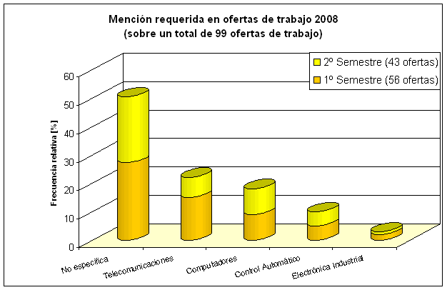 Analizando el gráfico obtenido, se concluye que un 50% de las ofertas de trabajo recibidas durante el 2008 no especifican en sus requerimientos la especialización (o mención) profesional.