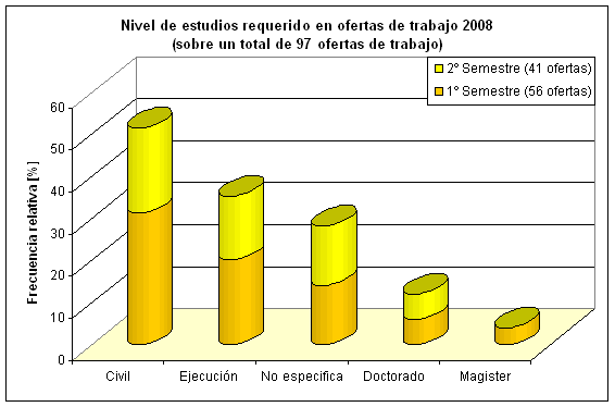 Observando el gráfico anterior, se observa que la mayor demanda en las ofertas laborales recibidas durante el 2008 corresponde al grado de Ingenierio Civil, requerido en un 51,5% del total de ofertas. Le sigue el grado de Ejecución, solicitado en un 35% del total de ofertas.