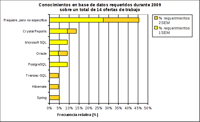 De un total de 14 ofertas de trabajo, 22 son los requerimientos de conocimientos de base de datos. La mayoría, con un de las ofertas no especifica conocimientos 45%. Los menos requeridos fueron , Transac-SQL, Hibernate y Spring con un 5%.