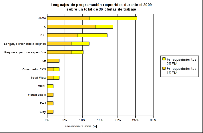 De un total de 18 ofertas de trabajo , 52 fueron los requerimientos de conocimientos de programacion ( una oferta requerir más de un lenguaje de programacíon). Los lenguajes más requeridos son: Java , con un 25% . C , con un 19% . C++ , con un 17%.