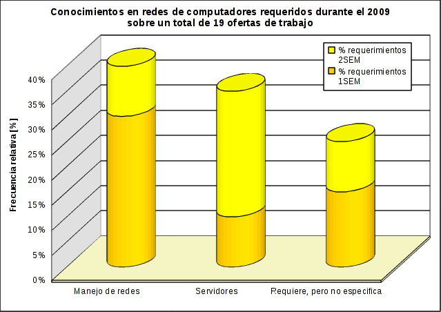 De un total de 19 ofertas de trabajo, 20 fueron los requerimientos de conocimientos en redes de computadores. El conocimiento más demandado corresponde al Manejo de Redes requerido un 40% . La minoría , con un 25% , no especifica conocimiento en redes de computadores.