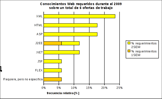 De un total de 6 ofertas de trabajo, 17 fueron los requerimientos de conocimientos web. Los conocimientos más requeridos son: XML , con un 24%. HTML y ASP , con un 18%. Los menos requer