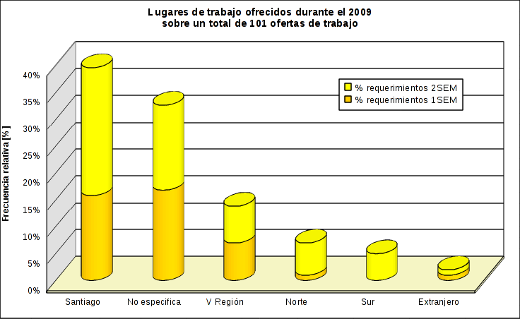 De un tota del 101 ofertas de trabajo, la mayoria, un 40%, de los trabajos ofrecidos dan lugar en la ciudad de Santiago. Además , tan solo 2% de las ofertas requiere trabajar en el extranjero.