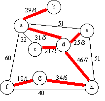 2.- Para el grafo de la figura l, muestre la solución obtenida usando el algoritmo de Dijkstra para el nodo b. Muestre el orden en que los arcos son incorporados en su solución. (si le complica la nodireccionalidad del grafo, reemplace cada arco por dos arcos direccionales de igual peso al indicado)