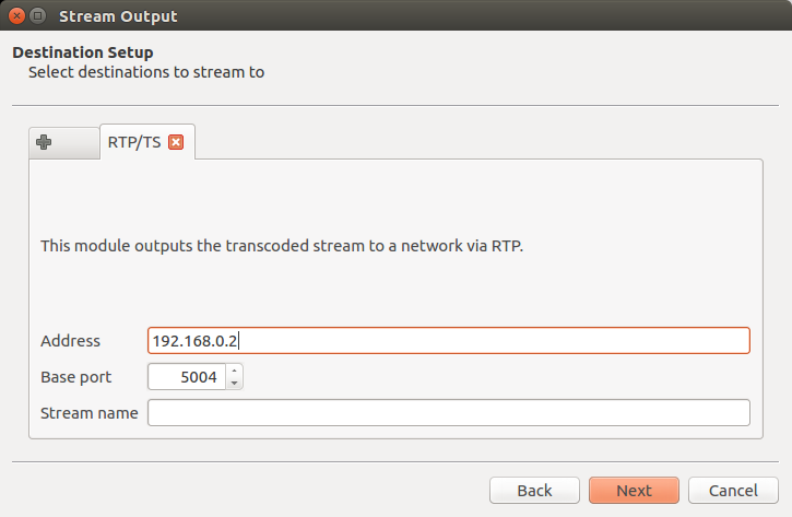 Al presionar el botón Add se agregará una pestaña para configurar el destino. Aquí se debe configurar la dirección IP del destinatario del flujo. También es posible cambiar el puerto a usar para la transmisión.