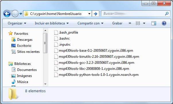 - Para instalar los paquetes descargados anteriormente se ejecuta el comando rpm -ivh <rpm> en el directorio donde guardo los archivos, por ejemplo rpm -ivh msp430tools-base-0.1-20050607.cygwin.i386.rpm. Proceder a instalar cada uno de los paquetes, recuerde usar la tecla TAB para facilitar este proceso.