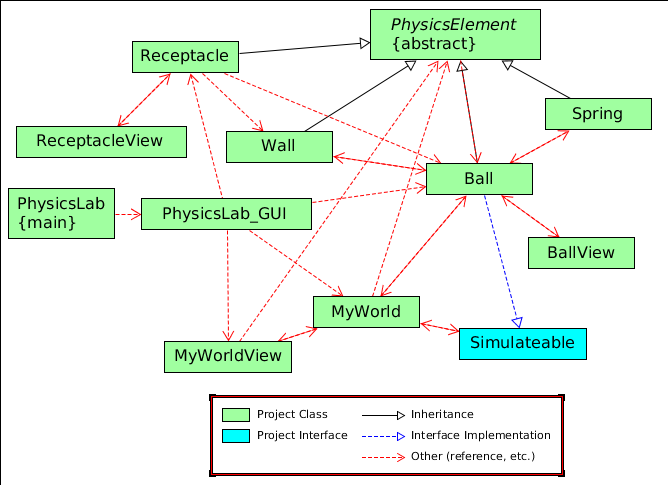 MyWorld maneja el modelo, también las clases Ball, Spring, Receptacle para