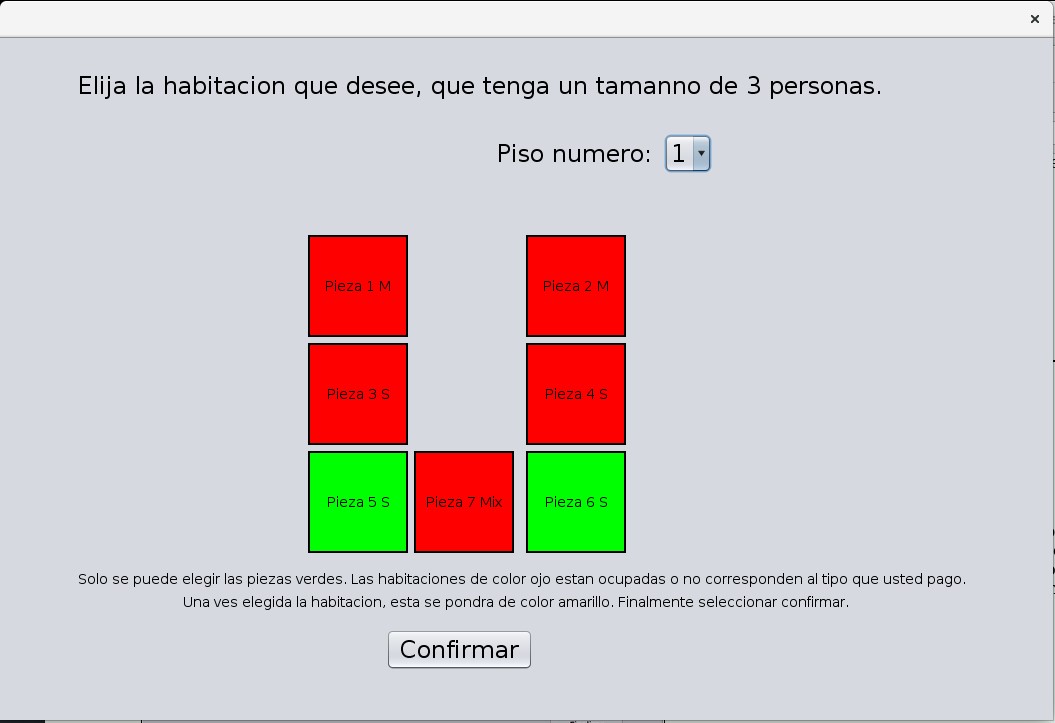 Esta vista es la que proporciona la información referente a las habitaciones en los distintos pisos disponibles para escoger , las que están en verde son las que puede elegir y las rojas, o están ocupadas, o son de otro tipo al de la reserva. |