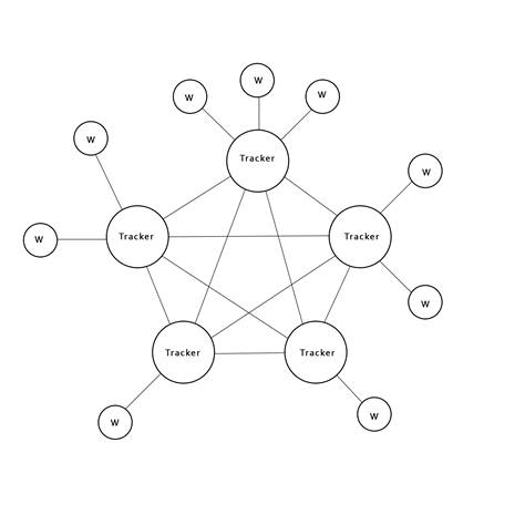 El Traker es el nodo que conoce y puede llegar a otros Trakers y que tiene cierta cantidad de Workers asociados a él, por lo cual cohesiona la red. Puede hacer stream de un mensaje al resto de trakers o a sus Workers. Puede unir y deslogear Trakers y Workers y puede ejecutar ciertas atribuciones del método de consenso que se explicarán más tarde.