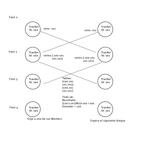 La elección del Tracker debe prever que los nodos tengan comportamientos no esperados descritos en el apartado de Bizantine Fault Tolerance. Por lo tanto se hace en varias etapas. Primero los Trackers emiten sus votos y hacen un Stream de ellos para todos los otros Trackers, el voto es un número aleatorio entre el menor de los Ids de los Tracker y el mayor (ejemplo: entre 100 y 107 para una red de 8 trackers). Los Trackers agregan todos los votos recibidos, incluido el suyo en una lista con la ID del tracker y su voto: