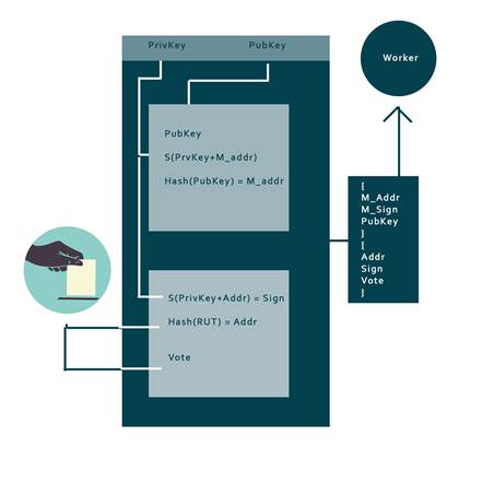 Supóngase una máquina que se encargue de procesar y publicar los votos, y dentro tenga un par llave pública y privada, en nuestro caso basado en el algoritmo rsa con encriptación SHA-256 (breve explicación). Cada vez que un votante ingrese a la máquina lo hará a través de un testigo (su RUT, una clave, un código QR, un dato biométrico, etc) en este caso su RUT, y luego hace la elección de su candidato, el cual será el "valor del voto". internamente la maquina hará un proceso de firma del voto: