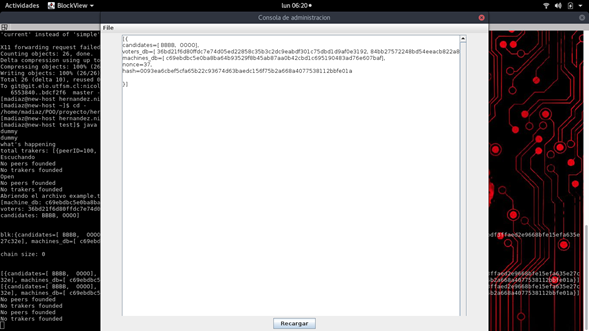 El bloque génesis no es más que un bloque cuyo payload tiene la lista de las máquinas habilitadas para emitir votos, el padrón electoral y el código de los candidatos. Este bloque es cargado a una consola de administración que funciona como el priemr Tracker de la red al cual los otros Tracker son conectados.