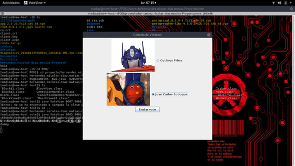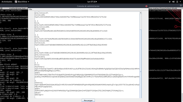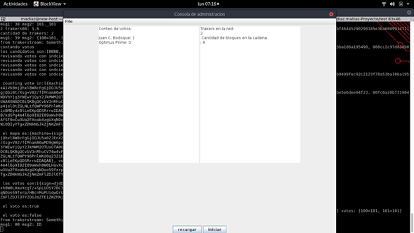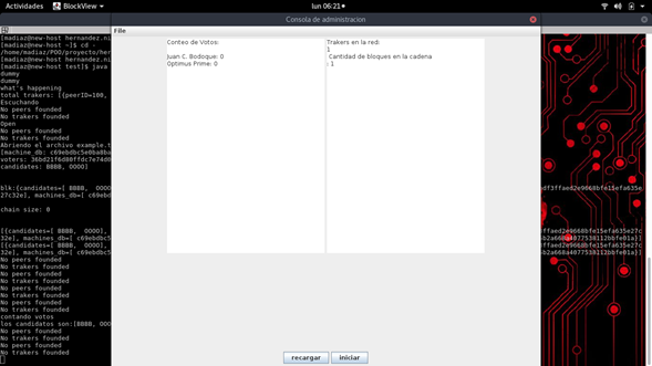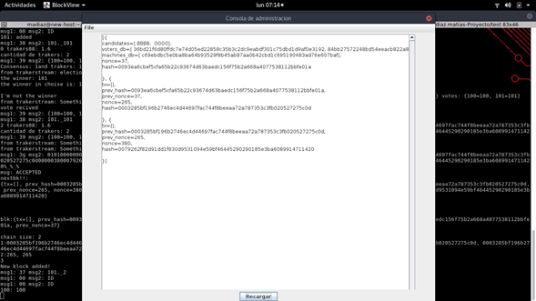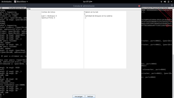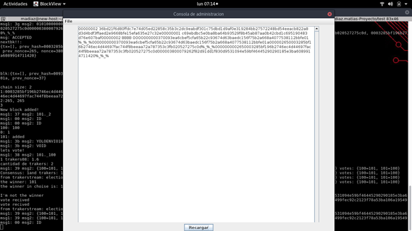 Existen 2 tipos de terminales de interacción, el que general el bloque génesis y sirve para ver las estadísticas de la cadena, y el que genera los votos.