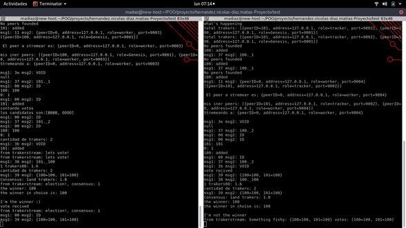 En la siguiente imagen se observa el proceso de elección del Tracker, dónde se lee el mensaje "I'm the winner :)" significa que ese Tracker fue elegido para pedirle a su worker que haga el siguiente blo que.