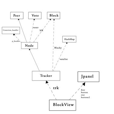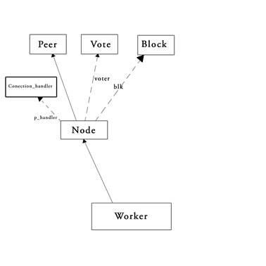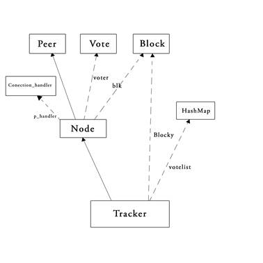 La implementación de este protocolo es un tanto complicada (código fuente) por lo cual hicimos uan simplificación, nuestra red elige de manera aleatoria a un tracker, y este a su vez elije a uno de sus Worker para generar el próximo bloque. Luego, cuando el bloque es construido, es publicado en la red y el Tracker elegido reinicia la votación.