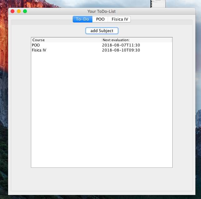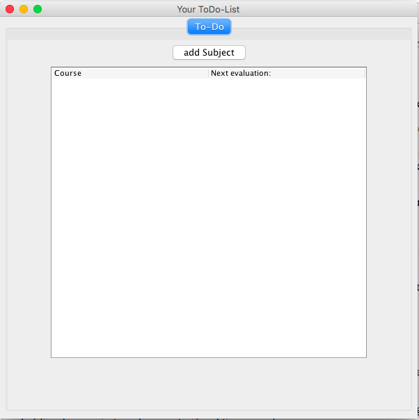 | Agrega el ramo a la lista de asignaturas. Además, agrega una nueva pestaña que contiene una lista que aún esta vacía, pero preparada para poder agregar evaluaciones |