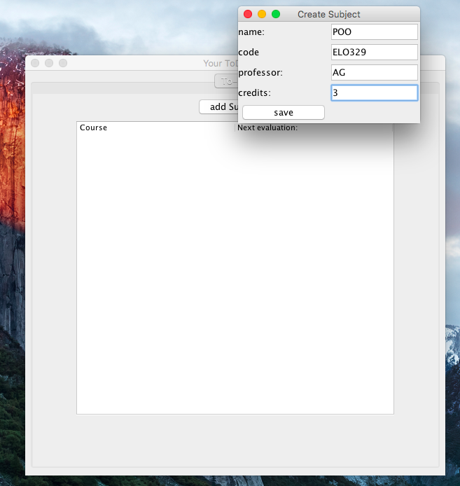 | Muestra una nueva ventana con campos a llenar. Los campos son: Name, Code, Professor y Credits. Termina con hacer click en "save" | |