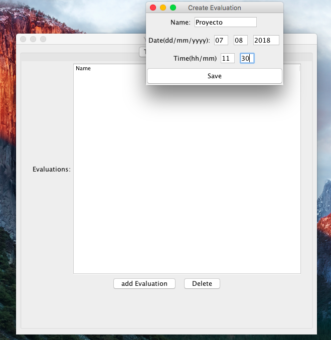 | Abre una nueva ventana con campos a llenar. Los Campos son: Name, Date y Time | |