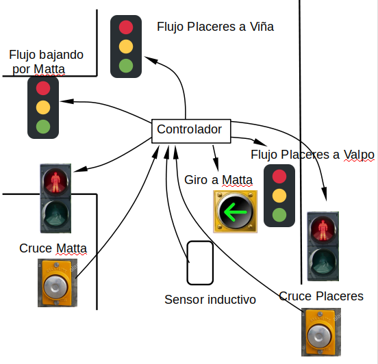 Modifique la clase Controlador para adminitir los tipos de semáforos presentes en esta intersección. Modifique el método manageTraffic para dar le paso a cada flujo de personas o vehículos según corresponda y siguiendo el orden que la esquina real asigna, excepto que su controlador sólo da el paso a peatones y perminso de giro a la izquierda de Placeres a Matta solo cuando un auto active el sensor magnético.