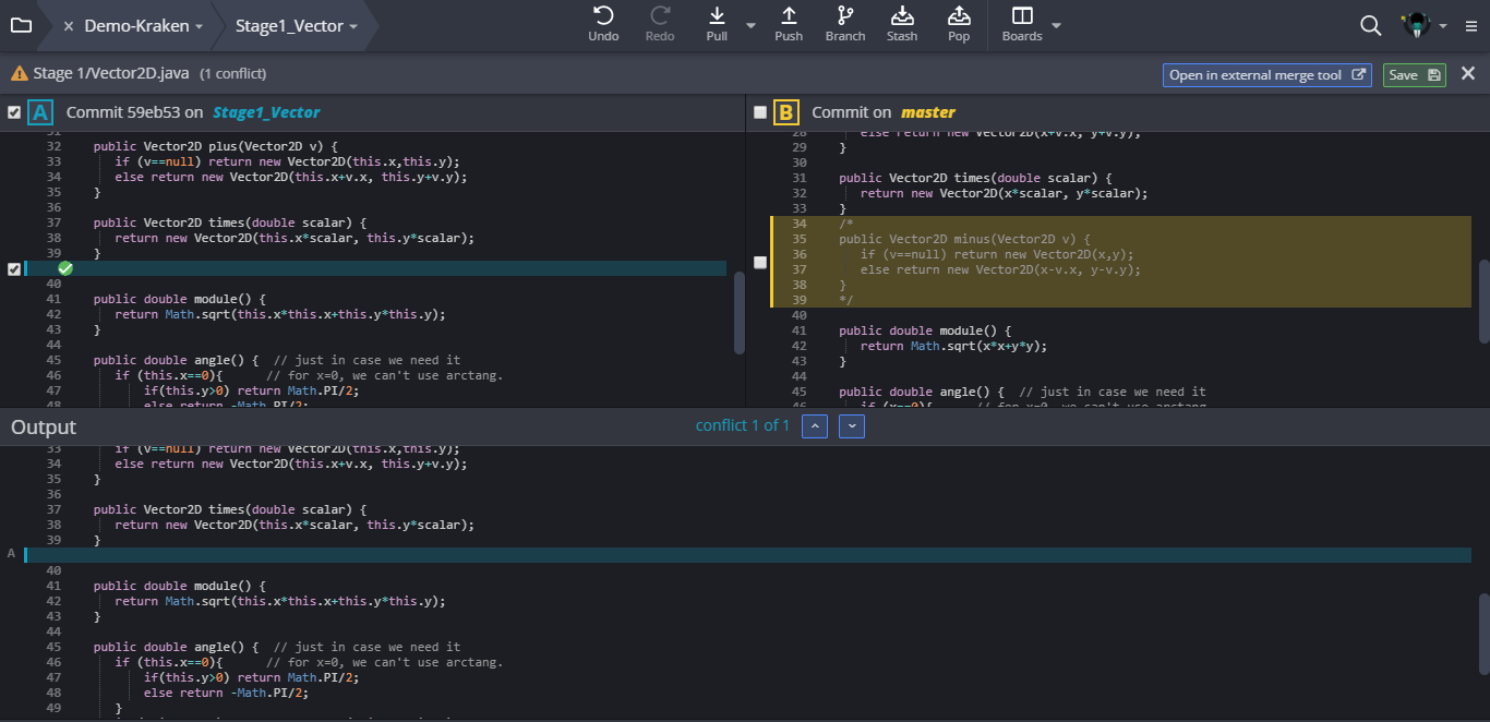 Es habitual al momento de trabajar con branches que se realicen cambios simultáneamente a un mismo archivo, pero en distintas ramas, ya sea por descuido o mala organización. En el ejemplo mostrado a continuación, en la rama master se ha comentado el método minus de la clase Vector2D, debido a que no es utilizado. Sin embargo, luego se trabaja en una rama dedicada a dicha clase, iniciada en un commit anterior al mencionado y después de otros cambios varios, se olvida lo realizado en la rama master y se decide eliminar completamente el método minus.