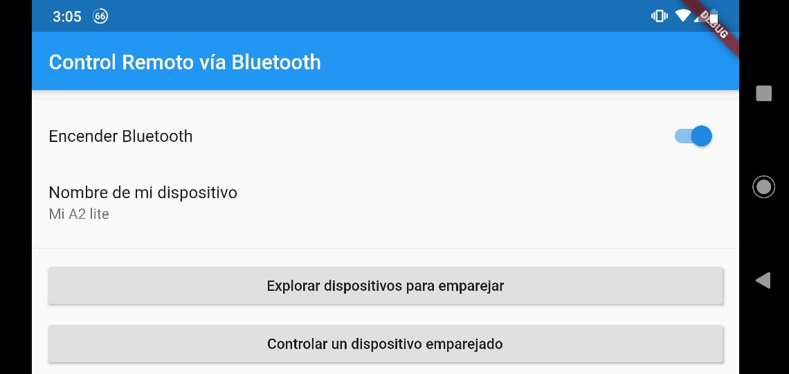 El usuario inicia la aplicación en el entorno , con el bluetooth encendido. Debe poder apagar o prender éste desde el menú de la app. Luego, puede acceder al menú de busqueda de bluetooth e identificar a otros dispositivos con el bluetooth encendido. El usuario se conecta al bluetooth de arduino satisfactoriamente |