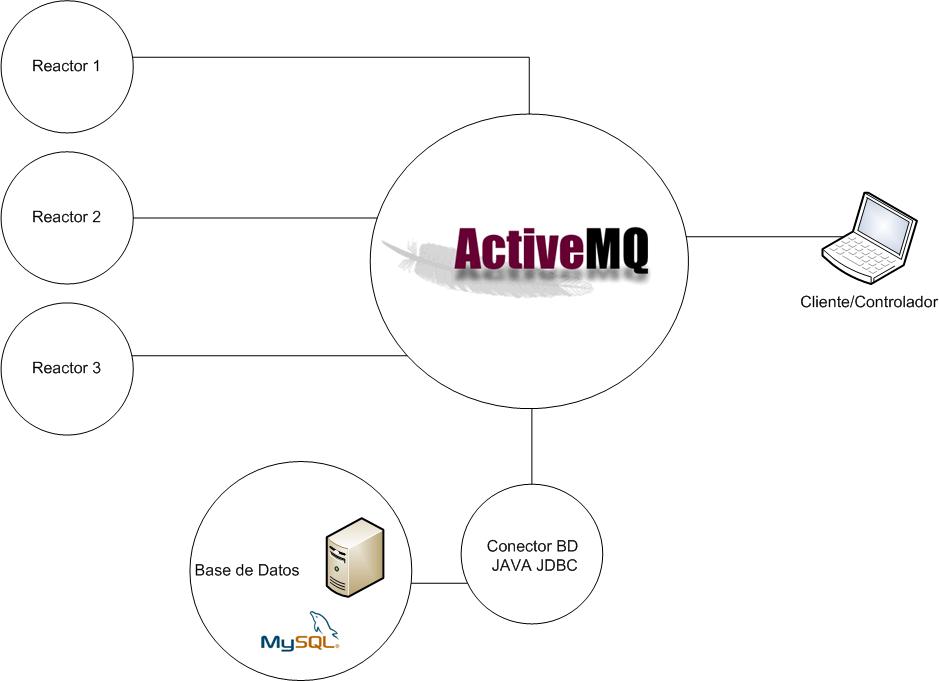 Los procesos publican colas de mensajes con datos relevantes del dispositivo específico (para este caso de prueba, son reactores reportando temperaturas y presiones).Los procesos crean conexión TCP con un servidor único que corre ActiveMQ, donde crean colas y publican los mensajes. Tanto el conector de Base de datos en java como el cliente pueden ver y consumir los datos de las colas.