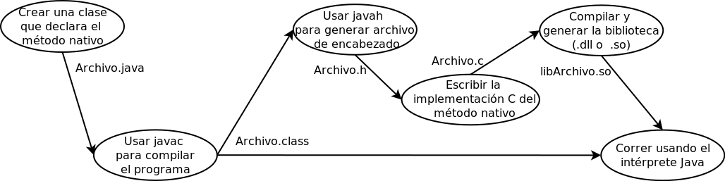 Notar la diferencia entre el nombre de la biblioteca y el nombre usado para cargarla en programa Java. Por convención como nombre de archivo se usa lib{NombreDeBiblioteca}.so Usamos .so para indicar que se trata de un Shared Object.$ export LD_LIBRARY_PATH=.Luego podemos ejecutar la aplicación: